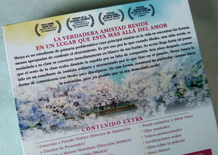 Y si hablamos de detalles, podemos afirmar que la mejor nota de la edición se la lleva el arte que encontramos dentro de la misma. Como es habitual en las ediciones coleccionistas, Selecta Visión intenta siempre traer todo el material que componen las originales japonesas; pero hemos de decir que en esta ocasión han realizado un excelente trabajo consiguiendo un fantástico libreto de 64 páginas en el que no solo encontraremos información adicional de la película, sino que podremos disfrutar de una serie de ilustraciones únicas en una calidad excelente y los propios storyboards de la película. Además, como ocurrió con las ediciones de Your Name, en este caso también han optado por incluir una postal en cada una de las ediciones de A Silent Voice, una postal única en cada ocasión y que en esta edición concretamente está protagonizada por Shoya y Shoko. Pero no solo nuestros ojos podrán disfrutar, sino que en este caso Selecta Visión también ha apostado por nuestro sentido auditivo y ha conseguido traer también los clips musicales de la cinta, los vídeos promocionales que se han empleado para publicitar la obra, un clip de vídeo que reúne todas las localizaciones reales de A Silent Voice y como material especial el clip de sonido que recopila «Inner Silence», la banda sonora que se compuso para finalizar la película. Sin duda alguna, una edición que te transportará al universo de A Silent Voice en su totalidad y que irradiará con su diseño en tu estantería.