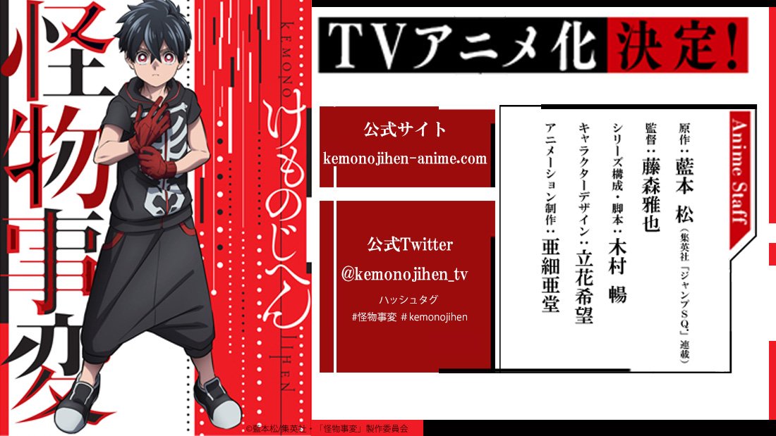 Dos meses después de confirmar el anime de Kemono Jihen, la compañía ha anunciado a través de sus redes sociales y página web cuál será el staff principal de la obra. Por un lado, Masaya Fujimori será quien dirigirá la serie, mientras que Noboru Kimura y Nozomi Tachibana serán los encargados de guion y diseño de personajes respectivamente. Por último, se ha confirmado que será Ajia-do Animation Works (Kakushigoto) el estudio encargado en dar vida a la obra de Shō Aimoto.