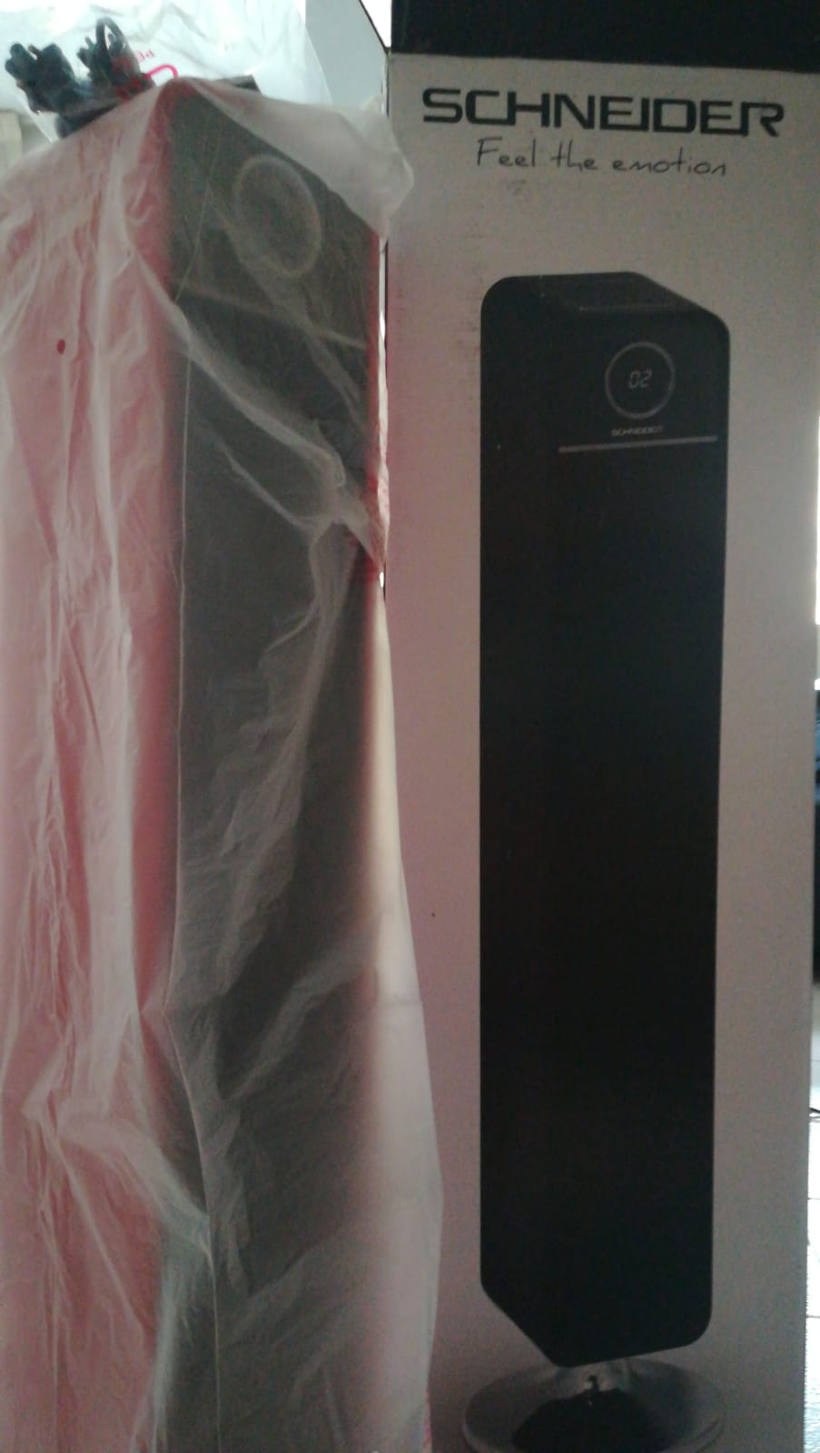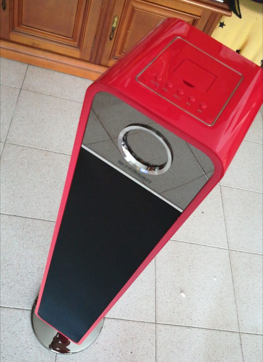 El nuevo producto protagonista de nuestras reviews nos llegó hace un par de semanas a la redacción de El Palomitrón: la Schneider Feeling’s Tower, una torre de sonido de doce kilos y un metro de altura barnizada con una brillante pátina de rojo intenso (disponible, además, en rosa, azul, blanco y negro). Esta torre nos llega con el anuncio del lanzamiento de una gama de pequeños electrodomésticos de diseño inspirado en los años 50, y lo cierto es que al ver uno de ellos de cerca, se entienden los premios l’Observeur du design otorgados en 2017 y 2018 por el APCI (organismo francés para la promoción de la creación industrial): su diseño retro y elegante es la primera grata sorpresa que nos encontramos al abrir la caja. En el frontal de la torre están el altavoz y el subwoofer, y una pequeña pantalla metalizada que nos indica la fuente del sonido, el volumen y el número de pista según sea el caso, así como el sensor del mando a distancia, cuya presencia es uno de los grandes aciertos de la Feeling’s Tower. Desde el mando a distancia puede controlarse todo: volumen, nivel del treble y el bass, fuente del sonido, play/pause, cambio de pista e incluso el ecualizador del sonido, que se puede cambiar entre flat, pop, rock, jazz, y nuestra propia combinación.