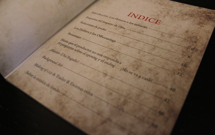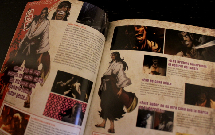 Otro de los extras más jugosos que trae esta edición es el libreto. Un complemento de 50 hojas perfecto para conocer más acerca de los personajes que aparecen, su mundo y cómo funciona todo como conjunto. Encontramos multitud de páginas con información biográfica (ficticia y real) de todos los personajes catalogados como ‘Drifters’ y ‘Offscourings’, además de detalles como los poderes o armas que portan en la serie. A parte de esta detallada información acerca de los personajes tenemos documentación sobre el clan Shimazu y los samuráis, el mundo de Drifters (razas, división y relaciones de poder, etc) y comentarios del productor sobre diversos aspectos interesantes de la serie. Los motivos acerca de la elección de los temas para el opening y ending (ambos muy buenos) así como su realización, detalles sobre las distintas lenguas del mundo de Drifters, escenarios y making off del CGI ponen el broche de otro a un libreto que profundiza bastante en el universo de la serie.