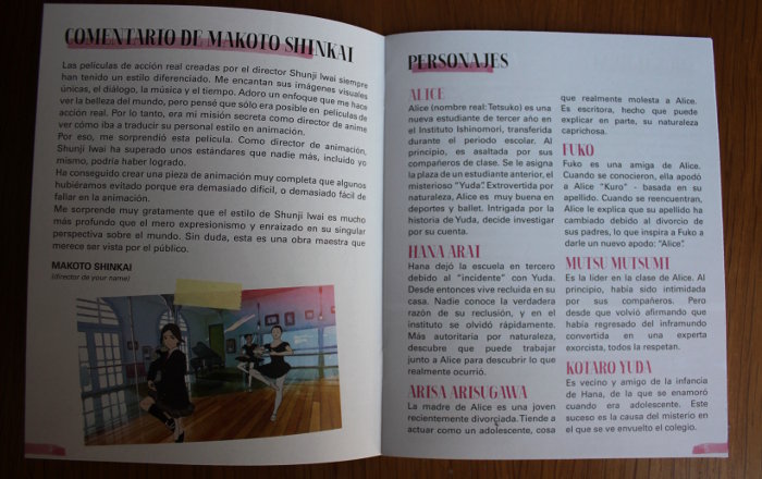 Por último, pero no por ello menos importante, también contamos con un libreto a color de unas 20 páginas aproximadamente lleno de extras y comentarios de los autores. No sólo encontramos comentarios de Shunji Iwai, sino que nos volvemos a encontrar con palabras de Makoto Shinkai. En este caso tienen más peso las palabras del autor de la obra, pues no sólo es un comentario, sino que nos encontramos ante una entrevista más que interesante y que nos permite conocer mucho mejor a la cinta y al propio director. Pero esto no es todo, en el libreto también hay un apartado donde se profundiza en los personajes de la película y otro donde se explica todo el making of del filme, desde el guion hasta la técnica principal empleada para rodar la película (rotoscopia). Unos apartados que si no te los cuentan no eres capaz de conocerlos con tan sólo ver la película, por lo que en este caso los extran le suman a esta edición un complemento imprescindible y que desde aquí recomendamos leer y ver al completo.