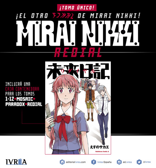 Este tomo fue publicado originalmente en Japón en 2013 junto a un OVA. Editorial Ivrea ya ha confirmado que ellos no traerán la OVA, pero a cambio elogiarán a los lectores de la obra con una caja contenedora, una que podrá albergar dicho tomo, toda la obra de Mirai Nikki ya publicada por la editorial tiempo atrás, Mosaic, Paradox y Redial.